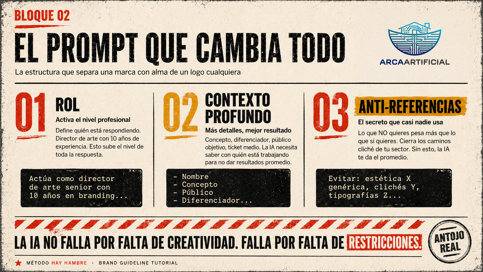 Esa última parte es la que más cambia el resultado. La IA no falla por falta de creatividad. Falla cuando no le damos parámetros claros. Y las anti-referencias son la forma más efectiva de sacarla de sus sesgos visuales.